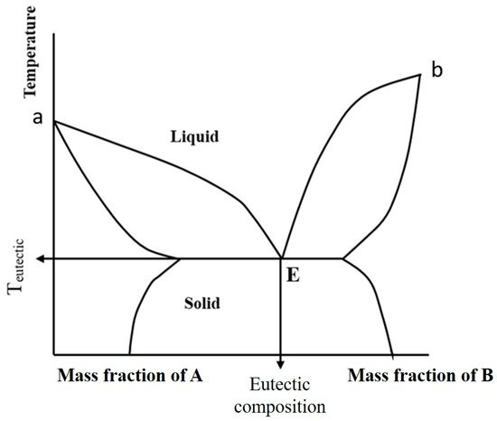 Phase diagram showing the eutectic point, E, and points a and b–the melting points of pure substances, A and B.