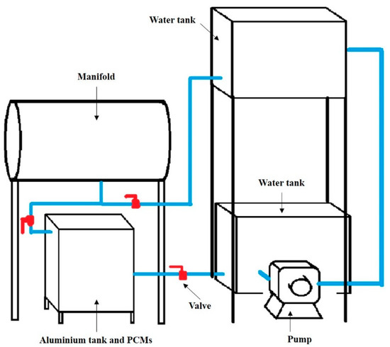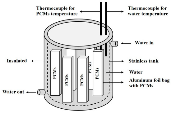 In Part 1, hot water (3 L) at 90 °C, i.e., at the minimum temperature, at which the evacuated tubes can produce heat. The water was poured into the PCM tank, see Figure 6, and we recorded the water and PCM temperatures after 2.5 h.