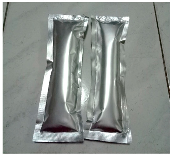 The evacuated tubular collector used for thermal energy storage is shown in Figure 4. The evacuated tubular collector received solar radiation for heating water in a manifold. The temperature of the water increased to a maximum around noon. The water was released to a stainless tank of which contained PCMs, shown in Figure 5. We measured the temperature of PCMs and water by using thermocouples. For the preparation of the sugar mixture, we used a flat aluminum foil bag (77 mm × 175 mm) shown in Figure 6, to store the sugar mixture. In the experiment, heat was exchanged between sugar and water. The temperature distribution along a horizontal cross-section was measured.