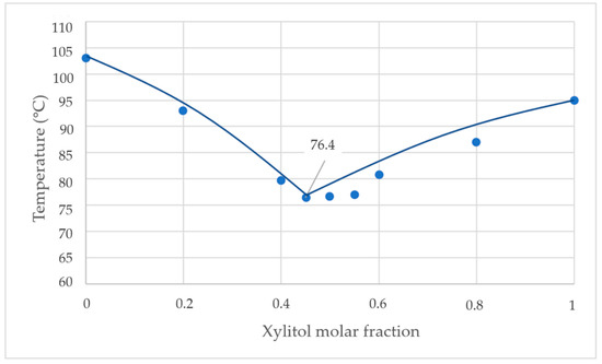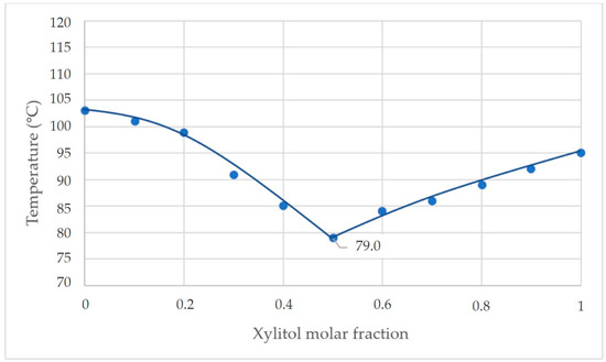 The first experiment shown in Figure 7 shows that the eutectic temperature of the mixture occurred at a mass fraction ratio of xylitol: fructose of 1:1. The eutectic temperature from the experiment was 79.0 °C.