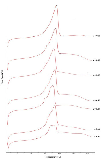 Previously, in Section 2.2, the lowest melting temperature of the mixture in any proportion was considered the eutectic temperature. We choose the proportion that made the mixture that had the lowest melting point, and confirmed the eutectic temperature of sugar mixtures by differential scanning calorimetry, using an NETZSCH—DSC 204 F1 calorimeter, at a heating rate of 10 degrees/min over a temperature range of 25–140 °C.