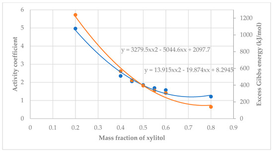 Relationship between mass fraction of xylitol, activity coefficient (blue), vs. Excess Gibbs Energy (orange).