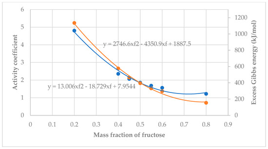 Activity coefficient (blue) and Excess Gibbs Energy (orange) vs. mass fraction of fructose.
