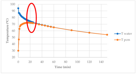 Temperature of hot water and PCMs vs. time: The red circle shows the region of significant heat transfer between water and the PCM.
