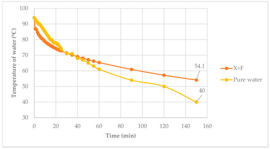 Figure 15 shows the temperature of the water with and without PCM versus time. The initial water temperature was 90 °C. The final temperature of the system after 150 min with the PCM was 54.1 °C or higher than the 40.0 °C without the PCM. The xylitol-fructose PCM helped maintain the temperature of the water. From calculation, the heat lost in the xylitol—fructose system was 503 kJ/kg, whereas in the pure water system it was 680 kJ/kg.