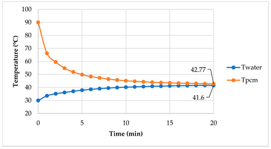 Figure 16 shows temperature versus time, when heating water with the PCM. Initially, the PCM was at 90 °C, while the water was at 30 °C. The PCM temperature rapidly dropped in the first 2 min, while the water temperature gradually increased. This is because the heat capacity of water is greater than the PCM and the water quickly absorbed energy from the PCM. After 2 min, the PCM temperature slowly decreased, because the PCM started to change phase from liquid to solid. The solid surface is practiced as a heat transfer resistance. This phenomenon was clearer, when we observed the system after 10 min, at which the temperature gradually reduced at a very slow rate. The PCM temperature at 20 min was 42.8 °C, while the temperature of the water was 41.6 °C. The experiment showed that water absorbed 146 kJ/kg of energy from the xylitol—fructose system.
