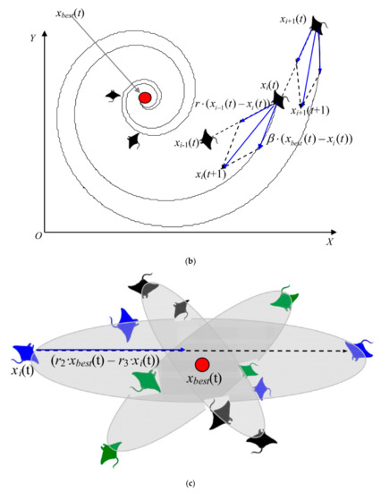 The MRFO algorithm is inspired by foraging strategies of manta ray, including chained, spinning, and turning. Figure 4 shows the chained, spinning and turning strategies in the MRFO algorithm [31,32]. The mathematical model of each strategy is described.