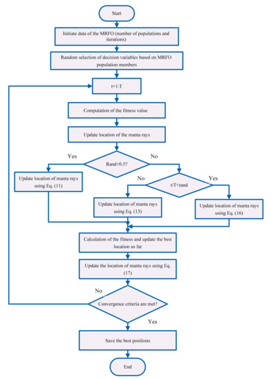 In each iteration, each manta ray updates its position relative to the two manta rays in front of it, as well as to the reference position. To perform the exploration and exploitation search, the t/T value reduces from 1/T to 1. In the case of t/T < rand, the best current position is selected as the reference position in exploitation phase, for t/T > rand a position is considered randomly as the reference position in the search space for the exploration phase. The MRFO method has the ability to switch between chain and cyclone strategies. The position of the manta ray can also be updated to the current best position based on the somersault strategy. The proposed steps and the update step are continued to establish the convergence conditions of the MRFO method, and finally the best position and the corresponding amount of fitness are determined. Flowchart of the MRFO algorithm is presented in Figure 5.