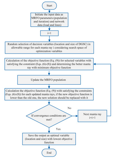 The flowchart of the implementation of the MRFO in allocation of the DGSCS in the network is depicted in Figure 6. After allocation of the DGSCs in the network, after finding the installation location of the DGSCs using the planning program the optimal distribution of the DGSCs power is found. The steps for using DGSCs based on the MRFO in planning problem are as follows: