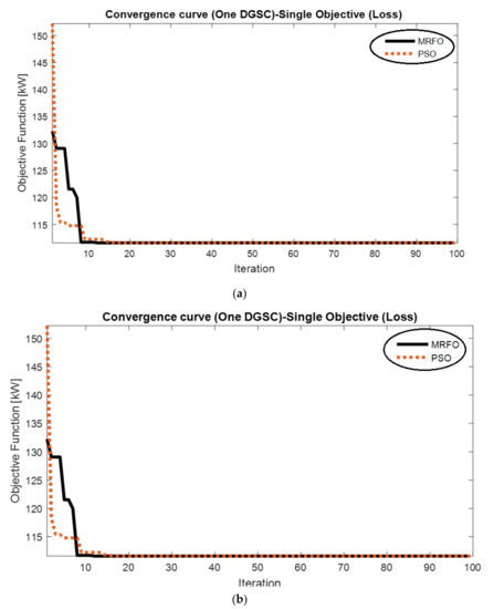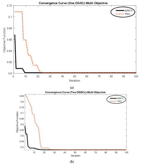 Allocation of the DGSCs is implemented based on peak load conditions via the MRFO. In this study optimal allocation of one and two DGSCs are considered. The allocation problem is performed using the MRFO algorithm and its capability is investigated with PSO. In this study, the PSO with variant inertia weight is used with cognitive component c1 = 1.5, social component c2 = 1.5, minimum inertia weight wmin = 0.4 and maximum inertia weight wmin = 0.9. The optimization results are presented first as a single objective with objective of losses minimization and then as a multi-objective method with objective of losses and voltage deviations minimization. The convergence curves of both methods are presented in Figure 8, which confirms the superiority of the MRFO with lower convergence tolerance and lower objective function. The results of single-objective allocation are presented in Table 1. As can be seen, in the case of using one DGSC, the performance of the MRFO and PSO methods is the same in terms of objective function value or the amount of power losses. In single-objective optimization with a DGSC, both methods have chosen bus 50 DGSC installation and for two DGSCs allocation, the proposed methods have also selected buses 50 and 51 for installation of two DGSCs.