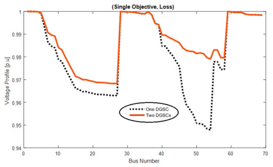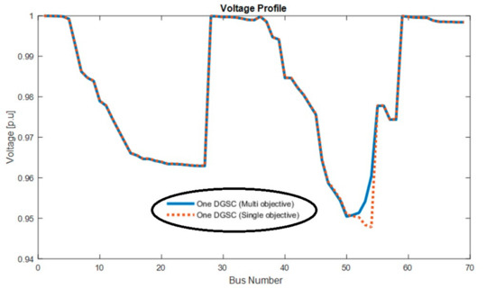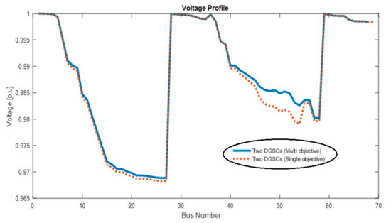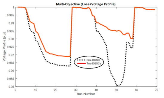 Also, the voltage profile for one and two DGSCs is shown in Figure 9, which shows that increasing the number of DGSCs improves the voltage profile or reduces the in the network.