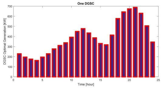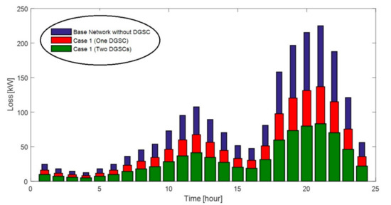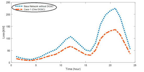 The optimal planning of one DGSC using the MRFO is presented in the first load case considering smart load in Figure 14. The base results of the 69-bus network demand show that loss of energy for the 24-h is obtained 2023 kWh. By installing one DGSC in bus 54 (obtained from the allocation problem) and by implementing the optimal planning of DGSC generation in the smart network, the total energy loss is reduced to 1259.39 kW (37.74% reduction). A comparison of system hourly energy losses before and after DGSC installation is depicted in Figure 15. Given this figure, it can be argued that the reduction of energy losses is significant, especially during peak times.