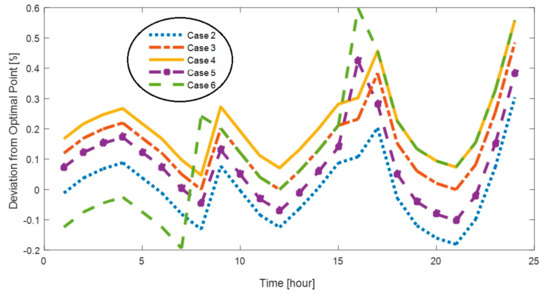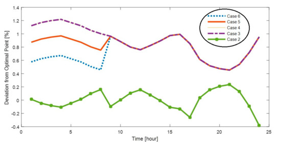 In Table 5, loss of energy and the losses reduction percentage of different cases are given. The loss of energy as well as deviation of output power of DGSCs from the optimal value with two DGSCs is presented in Figure 19 and Figure 20. As is clear, the loss of energy during considering smart demand is obtained less than the other cases (estimated demand). Case 2 is closer to the optimal case in view of lower energy losses. The worst case is related to Case 4, where the loss of energy related to conventional demand is more than the value obtained considering the smart demand.
