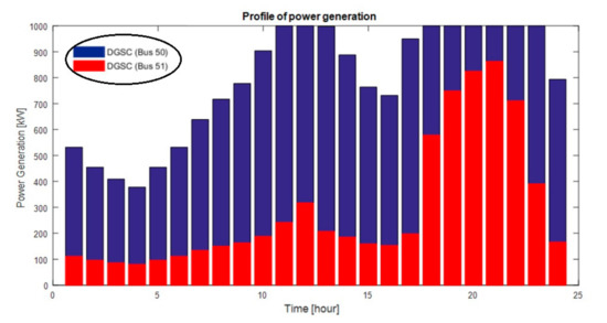 In this section, the optimal planning of two DGSCs in six different cases is performed using the MRFO method. The optimal generation of DGSCs is shown in Figure 17. The first DGSC is placed at bus 50 with size of 1000 kW and the second DGSC is located at bus 52 with size of 965 kW in the network. In allocation of two DGSCs considering smart load case, the energy loss is obtained 771.77 kW, which is reduced by 63.3% compared to the energy losses with allocation of one DGSC (1259.39 kW). The daily energy losses considering smart load is illustrated without DGSCs and with one and two DGSCs in Figure 18. This figure proved that effective impact of increasing the number of DGSCs in loss of energy reduction.