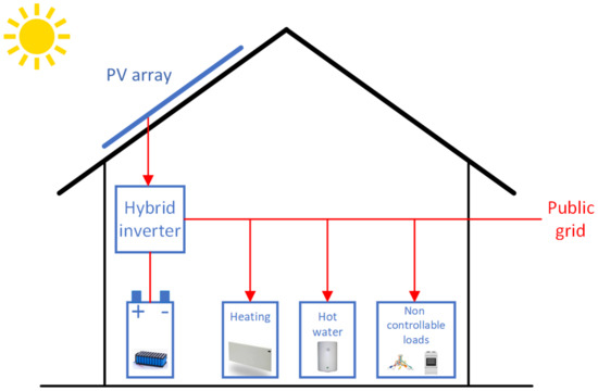 For the study of demand flexibility, a residential building was assumed that is located in Hungary. The building is equipped with an electric heating system, a separate water heater, a home energy storage system, and rooftop PV panels (see Figure 1).