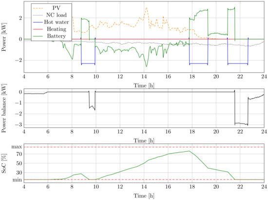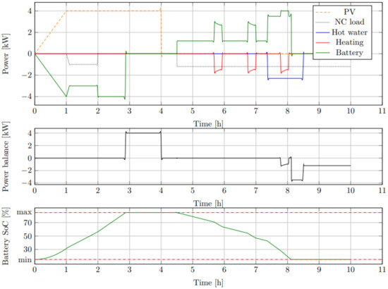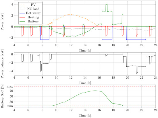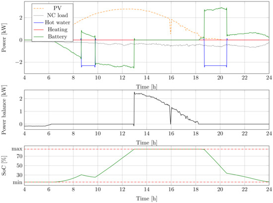 The model was tested with manual inputs. Figure 2 shows the model response for an arbitrarily chosen input set. In the beginning, there was no consumption. PV generation ramped up to 4 kW. It charged the battery and supplied the load between one and two. The power balance of the house remained zero until the battery was full. At Hour 5, the outdoor temperature dropped to −2 °C from 24 °C, making the space heater turn on after 40 min. Between Hours 6 and 8, 6 L/min hot water was also used. The battery supplied the noncontrollable load and the consumption of both heaters until the SoC reached its minimum level. The building was fed from the grid after Hour 8. It can be concluded that the proposed simulation model corresponded to the engineering expectations.