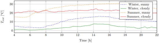 Figure 4 shows the environmental temperature () for the different scenarios. Temperature data were collected from the PV site ().