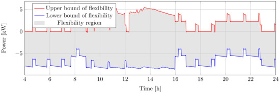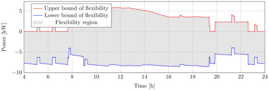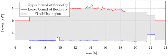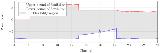 The available flexibility quantity from the heating system is calculated for both directions (Equation (12)). When the heater is on, its power consumption can be decreased, and the maximum upward flexibility is the difference between instantaneous power and zero. When it is off, downward regulation is available by turning the heater on.
