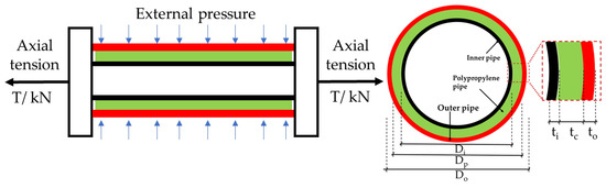 With the shortage of onshore oil and gas resources, marine engineering has gradually received attention [1]. Risers and pipelines are widely used in the development of marine resources because of their stability, safety, and efficiency. During installation and operation, the riser and pipeline are subjected to loads such as internal pressure, external pressure, waves, and internal waves. Risers mainly bear the combined action of external water pressure and axial tension, while pipelines are subject to external pressure, axial tension, bending moment, transverse loading, and torque [2,3,4,5,6,7,8]. The motion of the offshore platform will drive the cyclic movement of the pipeline, which leads to the riser bearing the cyclic load, and the loading sequence of external water pressure and axial tension is constantly changing [9,10,11,12]. The sandwich pipe has good thermal insulation performance and structural strength, can resist high external water pressure, and is gradually being valued and applied in deep-sea engineering [13,14,15,16]. The ultimate bearing capacity of the sandwich pipe will be reduced under the action of tension loads, which will cause local instability of the pipe. Due to the limitation of the experiment equipment, most of the tests apply the tension load first, and then apply the external water pressure to study the ultimate bearing capacity of the pipeline. However, the loading sequence of external water pressure and axial tension has a great impact on the ultimate bearing capacity of the sandwich pipe. It is necessary to study the influence of different loading paths on the bearing capacity of the sandwich pipe.