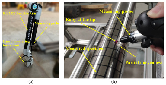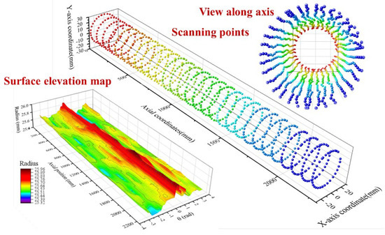 The spatial coordinates of the probe were recorded by software PCDMIS as shown in Figure 3. The recording frequency is set to fixed interval sampling, and the ovality of pipes is collected. As shown in Figure 3, 20 cross-sections are established through points in ABAQUS, and then the whole model of the pipe is built by connecting each cross-section. The measuring range of RA7320 is 2.3 m, with the point repeatability accuracy of 0.03 mm and the spatial length accuracy of 0.042 mm. For more information about the device and measuring scheme, refer to the authors’ previous work [43,44].