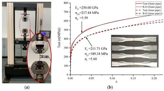 The stress–strain relationship obtained in uniaxial tensile tests is shown in Figure 4b, which can be described by the Ramberg–Osgood equation as follows: