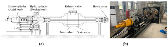 Both ends of the pipe are sealed with the flange which is connected to the pressure vessel and hydraulic cylinder with bolts before the buckling test. The pressure vessel is then filled with water and pressurized with a hydraulic pump, which pumps very slowly into the vessel (maximum pressurization speed 2 MPa/s) to achieve quasi-static conditions and avoid strain rate effects [44,45,46,47]. The pressure in the vessel is monitored by a pressure sensor, and the collapse pressure is defined as the peak value before the pressure in the facility suddenly drops when instability of the pipe occurs. The hydraulic automatic propulsion and locking devices are used in both the entry and exit of the test chamber.
