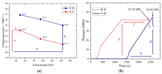 Parameter studies were carried out on two different loading paths to supplement the experimental results. The model parameters are shown in Figure 13. The same diameter and wall thickness as the test pipe are chosen, and the ovalities of the inner and outer pipes are 0.60% and 0.86%, respectively. The collapse process of the pipeline under the combined action of external pressure and axial tension is shown in the P→T and T→P loading paths in Figure 13. As the axial tension increases, the influence of different paths on the collapse pressure also increases. Axial tension will greatly reduce the collapse pressure in any loading path. The collapse pressure of the P→T loading path is smaller than the collapse pressure of the T→P loading path. Therefore, the P→T loading path in actual engineering is more severe.