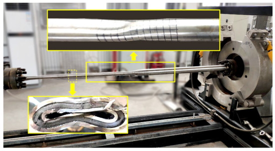 After geometry measurements, all the samples were put into the pressure vessel for collapse experiments. The test setup is shown in Figure 5. The main parameters of the inner diameter of the pressure vessel are 240 mm, and the total length is 4.453 m, with a pressure capacity of 110 MPa, which is suitable for buckling test of pipes with a length of 2.3 m and external diameters ranging from 8 to 76 mm. In addition, regular and random vibration loads can be applied in horizontal directions, and the frequency range of loading is 0.1~40 Hz, which can simulate the vibration behavior of pipe/beam under high external pressure and axial load.