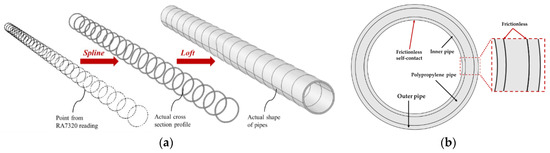 For model validation, a sandwich pipe model with local imperfection was established within the framework of the nonlinear finite element code ABAQUS 6.14. General static was selected as the solver. The stress–strain relationship obtained in the uniaxial tension test is described by the Ramberg–Osgood equation in the FE models, which could be expressed as Equation (2). As shown in Figure 3, the geometry features of local ovality defects were the input sequence by Spline base on the test results. The actual shape profile of the ovality imperfection is obtained by connecting the sections with loft as shown in Figure 8. After establishing the model of the inner and outer steel pipes, the two models were combined and the middle layer of the inner and outer pipes was set to be polypropylene pipes. The same material parameters in the experiments are applied to the models. In the experiment, both ends of the pipeline are fixed, so all the degrees of freedom at both ends of the model are restricted in the numerical simulation. The eight-node linear brick and incompatible element C3D8I was used to describe the steel pipe, PP pipe. Meanwhile, self-contact with frictionless was chosen as the interaction between the inner face of the pipe. The normal direction contact between the polypropylene pipe and the steel pipe is set as frictionless and hard contact, and a default penalty function is set. Certainly, the bonding force between epoxy resin and steel pipe is very small. Epoxy resin mainly plays the role of filling pores and transferring force, which is generally defined as frictionless [46]. The numerical simulation results fit the experimental results with frictionless interaction definitions.