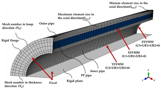 For the parametric study, the sandwich pipe models were simplified as an axisymmetric 1/8 model, as shown in Figure 9. In the parametric analysis, the overall ovality is used as the main parameter of the initial defect of the pipe, and the ovality is determined by Formula (2). The ellipse tool in ABAQUS is used to draw and create a sandwich tube. The contact condition of the sandwich pipe is completely consistent with the model in the verification part. The interaction between the steel pipe and core layer is defined by a penalty contact algorithm with no friction [31]. As shown in Figure 9, to save the calculation cost, the model is simplified to a 1/8 model. Two sides of the model are provided with symmetrical boundaries, respectively (U1 = UR2 = UR3 = 0, U2 = UR1 = UR3 = 0), one end connected to the flange is completely fixed (U1 = U2 = U3 = UR1 = UR2 = UR3 = 0), and the other end is a symmetrical boundary along the pipe axis (U3 = UR1 = UR2 = 0). The setting of boundary conditions is the same as Gong et al. [24]. The contact between the rigid plane of the model and the inner surface of the inner pipe is non-friction and hard contact, and the separation is allowed after the contact for the simulation of the process of pipe buckling propagation.