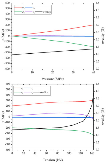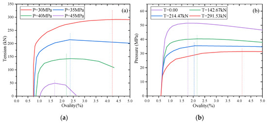Changing the collapse pressure and axial tension of the sandwich pipe, as shown in Figure 6, the influence of different paths on the collapse pressure of the sandwich pipe is between 0.3% and 4.9%. With the increase of the axial tension, the influence of the axial stress on the circular stress in the P→T loading path increases. The ovality of the pipe increases as the circular stress increases.