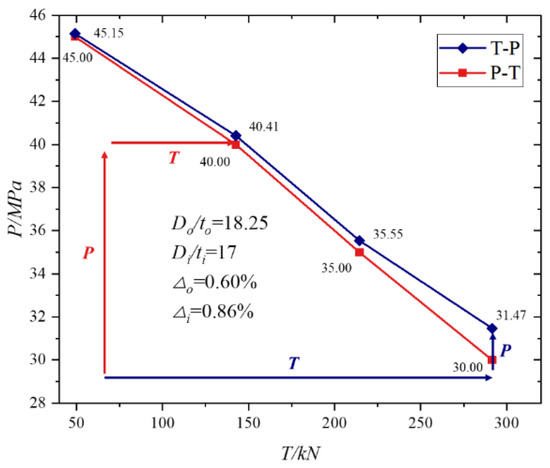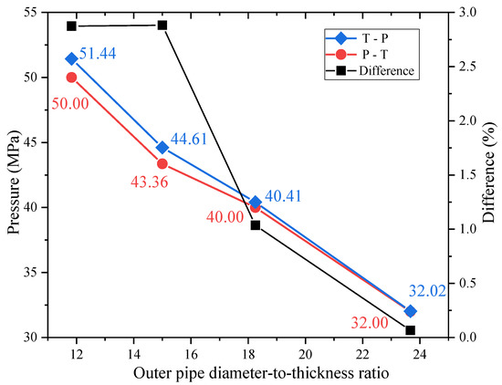 In this section, the influence of different outer diameter-thickness ratios on the collapse pressure of the sandwich pipe is studied. The outer pipe diameter-to-thickness ratios are chosen as 11.83, 15, 18.25, and 23.67. In these analyses, the geometric dimensions of the core layer and the inner pipe did not change; only the wall thickness of the outer pipe was changed, and the ovality of the outer pipe was maintained at 0.6%. The selected material parameters and contact conditions are the same as the model in Section 3. As shown in Figure 11, the black lines represent the influence of different loading paths on the load-bearing limit of the sandwich pipe. A total of 80% of the collapse pressure of the sandwich pipe without being affected by the axial force is selected as the external pressure loaded in the P→T path. The maximum tensile force in the P→T loading path is taken as the tensile force value in the T→P path. When the diameter-to-thickness ratio of the outer pipe is greater than 18, the difference in the collapse pressure of the sandwich pipe under different loading paths is less than 1%, which has little influence in actual engineering applications. However, as the depth of ocean development increases, the diameter-to-thickness ratio of sandwich pipe and risers is often less than 18 to ensure safety during operation.