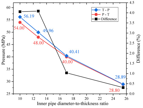 It can be seen from the black line that when the diameter-to-thickness ratio is greater than 17, the influence of different loading paths becomes smaller, and the difference is less than 1%. When the ratio of diameter-to-thickness is less than 12.75, the difference ratio does not change significantly. The influence of the inner diameter-to-thickness ratio on the ultimate strength of the sandwich pipe under different loading paths is in the range of 0~4.05%, which is greater than that of the outer pipe diameter-to-thickness ratio. Different loading paths have different effects on sandwich pipes with different diameter-to-thickness ratios. Therefore, for sandwich pipes with large inner pipe diameter-to-thickness ratios, the pipe is more likely to collapse under the P→T loading path.