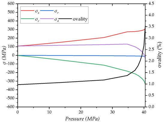 As shown in Figure 15, the axial tension increases by 142.79 kN, the circular stress and von Mises stress increase by 107.54 MPa and 108.50 MPa, and the circular stress decreases by only 1.83 MPa. The axial stress contributes the most to the element stress. In the second step of loading, as the external pressure increases, the axial stress hardly changes. The circumferential stress increases from 1.83 MPa to 333.23 MPa, with an increase of 331.40 MPa. When the axial stress is 183 MPa, the von Mises stress reaches 273.63 MPa, the material yields at point A, and the ovality of the section increases rapidly with the increase in external pressure. The pipe collapsed when the ovality reached 3.54%, and the ability of the sandwich pipe to withstand water pressure dropped sharply. Additionally, due to the increase of external water pressure, as shown in Figure 16, the circular stress changes significantly, and the circular stress curve (purple) is almost the same as the von Mises stress curve (red). However, the external pressure increases the von Mises stress by 203.45 MPa, which is higher than the increase of the water pressure on the von-Mises stress in the T→P path. The circular stress of the section increases from 18.47 MPa to 73.06 MPa as the axial tension increases, which will lead to faster local yield at point A.