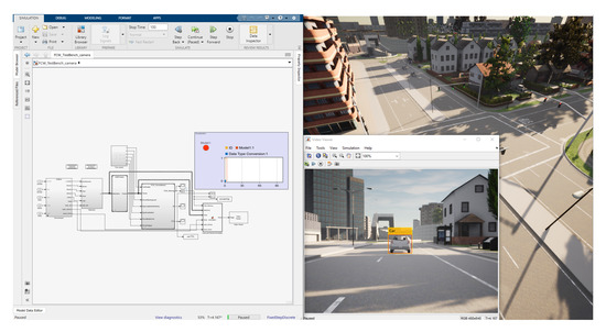 CARLA has a python-based core with embedded physics simulation which is capable of generating realistic measurements. In order to retrieve reliable sensor data, the simulation is carried out in synchronous fashion between the two environments; in particular, Simulink acts as a client by sending simulation commands to CARLA, acting as a server, which replies with the new generated measurements. In order to link the two environments a series of API have been implemented to create a communication between matlab-based Simulink and python-based CARLA cores. Figure 2 shows a screen capture of the proposed platform during a use case. In the case of the FCW feature the raw RGB frames are required, which are generated, at 30 fps, by a camera attached to a moving vehicle, mounted behind the windshield. The raw frames are the input to the algorithm introduced in Section 2.