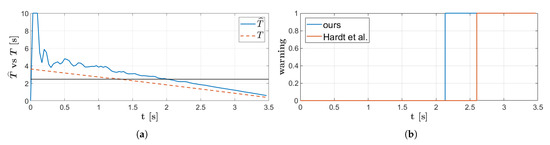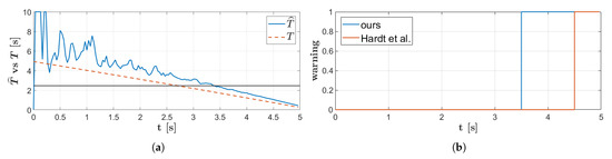 Simulation results, through MIL testing, in the CCRS scenario. (a) Time-history of the estimated time-to-collision, , and of the real one, T. The warning threshold is shown as a constant horizontal line; (b) time-history of the forward collision warning activation.