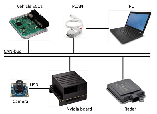 During MIL tests one can use the ground truth quantities, given by the simulator, to assess performances, whereas during experimental validation a second reliable source of information is required in order to make the same kind of assessment. In particular, an automotive RADAR was used, namely, ARS 404-21 from Continental, which can directly measure obstacle distances and relative velocities accurately; thus, it is possible to use Equation (1) to evaluate the TTC and make a comparison with the camera based in Equation (8). Finally, RADAR messages and warning activation signals, along with other vehicle data of interest, were collected from the vehicle CAN-bus using a PCAN-USB by PEAK System. Figure 5 shows the chosen hardware architecture and Figure 6 shows the electric platform employed during in-vehicle experiments.