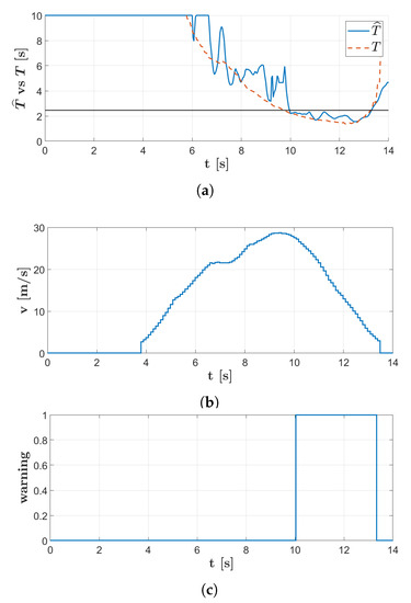 Results of the experimental validation in a CCRS scenario. (a) Time-history of the estimated Time-To-Collision, , compared to the estimated through the RADAR sensor, T. The warning threshold is shown as a constant horizontal line. (b) Time-history of the vehicle speed. (c) Time-history of the Forward Collision Warning activation.