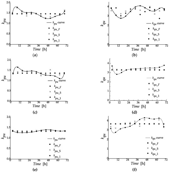 Fitting curves of kpu and kqu with the corresponding values (kpu_F and kqu_F) in three characteristic days obtained by using electrical variables, and kpu and kqu obtained by using five (kpu_5 and kqu_5) and one (kpu_1 and kqu_1) meteorological variable, in (a,b) winter; (c,d) spring/autumn; (e,f) summer.