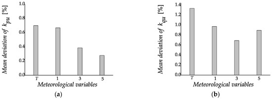 For comparison, Figure 3 presents the mean deviations of kpu and kqu when only ambient temperature is applied for parameter estimations, and when the minimum (1), average (3), and maximum number of meteorological variables (5) are used according to the procedure described in Section 2. The mean values of deviations when ambient temperature is used are the largest and the most similar to those when only one meteorological variable is used.