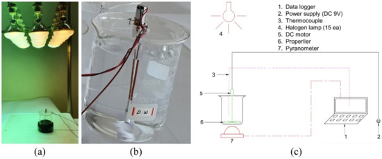 Figure 2 shows the photothermal energy conversion experimental setup. In Figure 2a, to make a thermal source similar to solar thermal radiation, 15 halogen lamps (300 W × 15 = 4500 W) were installed with a power supply and data logger. A thermal collector containing nanofluids was placed directly beneath the lamp array. Assuming that the thermal radiation of the lamps was received vertically, the side of the nanofluid container was insulated. The fluid temperature was measured inside the nanofluid using K-type thermocouples, and the measurement location was kept constant. All nanofluids were supplied with insolation under the same conditions. The temperature was measured every 2 s, and the experiment was performed at nanofluid temperatures ranging from 21.4 °C to 50.4 °C. The thermal performance of the nanofluid was compared using the time taken to reach the target temperature of 50.4 °C. The experimental equipment was installed indoors to minimize the external factors. In addition, to prevent the sedimentation of nanoparticles, a fan and a DC motor were used at a 9 V and 325 rpm, respectively, as shown in Figure 2b. The schematic diagram of the experimental setup is shown in Figure 2c.