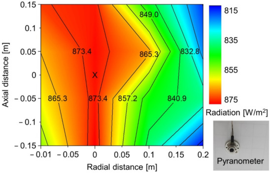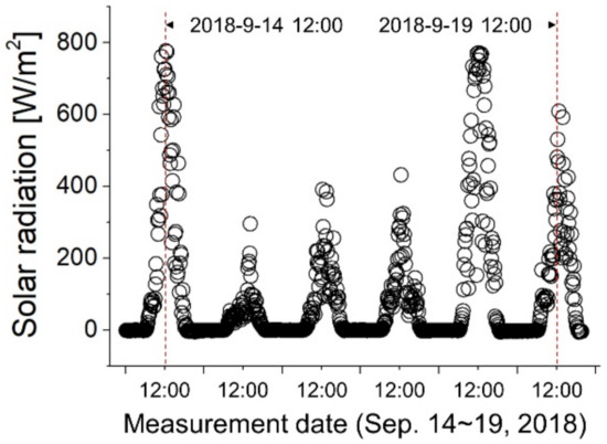 South Korea is located between 35.9° N latitude and 127.7° E longitude, and the average monthly solar radiation is estimated to range from 2.56–5.48 kWh/m2 [32]. Figure 3 shows the instantaneous solar radiation measured in Tongyeong City, South Korea, for the selected dates in September 2018. The solar radiation was measured using a pyranometer (MS-802, EKO Instruments Co., Ltd., Tokyo, Japan). The level of thermal radiation fluctuated with time and date; however, for most of the day, the highest radiation occurred at around 13:00. The maximum solar radiation was approximately 800 W/m2. Therefore, in this study, more than 800 W/m2 of thermal radiation was supplied by 15 halogen lamps for the thermal absorption of nanofluids. The same pyranometer was used to measure thermal emitted from the light source, as shown in Figure 3. Figure 4 shows the thermal radiation color map for different measurement positions. By adjusting the distance between the halogen lamps and the thermal collector, the height of the lamp that generated approximately 870 W/m2 of thermal radiation was found, and the experiment was conducted by locating the thermal collector at that point.