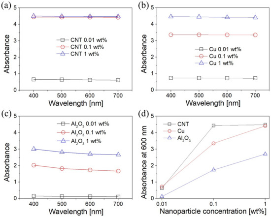 Vis absorbance spectra of nanofluids with three different nanoparticle concentrations (where “1 wt.%” indicates distilled water 99 wt.% + 1 wt.% of a certain type of nanoparticles). (a) Multiwalled carbon nanotube, (b) Cu, (c) Al2O3, and (d) absorbance at 600 nm.