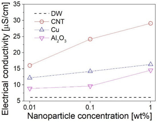 - In all nanofluids used in the experiment, the absorbance and EC increased as the concentration of nanoparticles increased. The maximum electrical conductivities occurred at the test cases of CNTs, and the EC enhancement compared to DW was approximately 300% at 0.01 wt.%, 400% at 0.1 wt.%, and 500% at 1.0 wt.%.