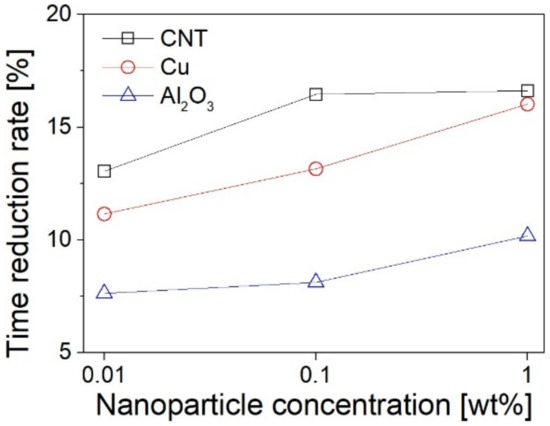 To further understand the thermal absorption characteristics of nanofluids, the effect of nanoparticle type and the nanofluid concentration on the time reduction rate (based on DW) to reach 50 °C from an initial temperature of 20 °C are presented in Figure 8. At the nanoparticle concentration of 1 wt.%, the maximum time reduction rate for each type of nanofluid was CNTs, Cu, and Al2O3, and their values were 16.6%, 15.5%, and 10.2%, respectively. In the case of carbon-based nanofluids, when the time reduction rate of 0.01 wt.% nanofluid was compared with the time reduction rate of 0.1 wt.% and 1 wt.% nanofluid, it was found that the time reduction rate of 0.01 wt.% nanofluid was relatively lower than that of the 0.1 wt.% and 1 wt.% nanofluids. The results of the thermal absorption performance of the CNTs nanofluids with increasing concentrations are consistent with the absorbance results shown in Figure 5d. Thus, adding approximately 0.1 wt.% of nanoparticles is more economical than increasing the concentration of nanoparticles. This can reduce adverse effects such as channel clogging and increased pumping force due to the flow of nanoparticles and can reduce pipeline damage in heat transfer systems. Therefore, according to the results of the thermal absorption performance for CNTs nanofluids in this study, 0.1 wt.% was the optimal concentration. In the case of metal-based nanofluids (Cu), unlike carbon-based nanofluids (CNTs), the time reduction rate increased constantly compared to the increase in nanoparticle concentration. In the oxide-based nanofluid (Al2O3), the time reduction rates were 7.4%, 9.4%, and 14.1% for 0.01 wt.%, 0.1 wt.%, and 1 wt.%, respectively. Test cases for 0.01 wt.% and 0.1 wt.% nanofluids showed similar time reduction rates, and the 1 wt.% nanofluid showed a large increase in time reduction rates. The thermal absorption performance of the Al2O3 nanofluids with increasing concentrations is consistent with the EC results shown in Figure 6. These results are different from those of CNTs and Cu nanofluids, and it was confirmed that Al2O3 nanofluids have high economic feasibility of 1 wt.% nanofluid. Therefore, it was confirmed that the heat transfer performance of the oxide-based nanofluid exhibited a tendency opposite to that of the carbon-based nanofluid.