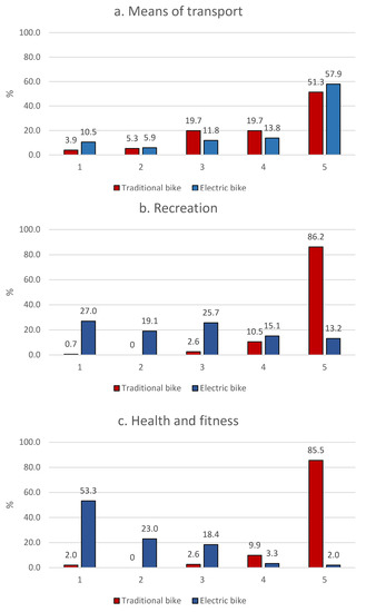 In view of this, if the electric bicycle is largely perceived as a normal bicycle, it can be pointed out that there is no chance to radically change the transport culture by electrifying bicycles. On the other hand, differences in respondents’ perceptions of the two analysed types of bikes are marked in terms of their use for recreation and for improving health and fitness. The electric bicycle is regarded as a tool that is not suitable for these purposes, whereas the traditional bicycle can successfully fulfil this role. The juxtaposition of these two functions—transport, and recreation and health—shows that electric bicycles do not find their place in either field. The verification of the hypotheses set in the study reflects this observation.