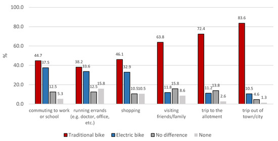 These results are also confirmed by the answers concerning the choice between the traditional bike and the electric bike in hypothetical situations. Where the questions concerned journeys to work, school, errands (e.g., with the public administration), or shopping, indications for the electric bicycle ranged from 37.5% to 32.9% (and were between 5% and 14% higher for the traditional bike). In the case of journeys associated with recreational purposes, such as a visit to the family, a trip to the allotment, a trip outside the city, the indications for the traditional bicycle prevailed (from 63.8% to 83.6%), with a constant share (10.5 and 11.8%, respectively) of declarations concerning the choice of an electric bike (Figure 2).