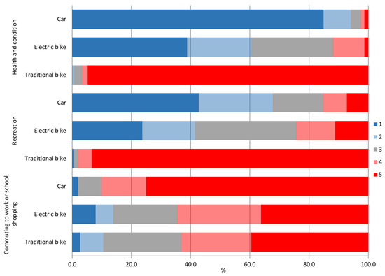 Some discrepancies in the answers of the respondents concerning the use of bicycles as a means of transport result from the comparison of assessments (Figure 1) and potential behaviour (Figure 2). The latter seem to point to less confidence in the electric bicycle, which is less often chosen in hypothetical situations (see Appendix A, Table A1 and Table A2). However, regardless of this, the picture obtained is in line with the assessments in which the passenger car was additionally included (Figure 3, Appendix A).