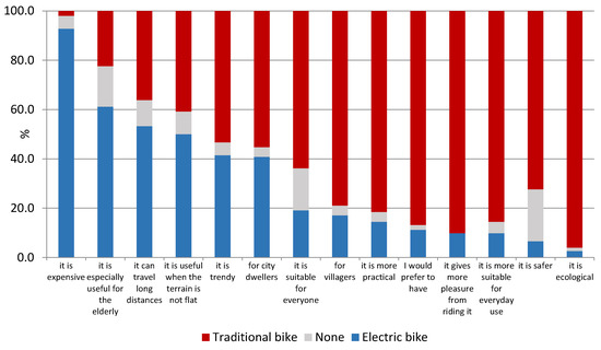 Respondents were also asked to refer to the opinions quoted in the survey indicating which type of bicycle they were more suited to (Figure 4). The pattern of responses strongly suggests that electric bikes were perceived worse than traditional bikes (see also Appendix A Table A4). First of all, almost 93% of those surveyed believed that the indication ‘it is expensive’ was more suitable for the electric bike. On the contrary, as many as 96% say that the term ‘it is environmentally friendly’ should be attributed to the conventional bicycle. Respondents did recognise the positive features of the electric bike: that it can be particularly useful for the elderly (61% vs. 22% for the traditional bike), that it can be used to cover long distances (53% vs. 36%), and that it is ‘useful when the terrain is not flat’ (50% vs. 41%), but although the responses seem quite obvious given the objective advantages of an electric bike, these are not particularly high percentages.