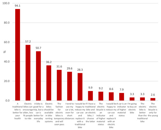 The results obtained in the survey confirm that the electric bicycle is treated in a rather distrustful way. Its undoubted advantages are marginalised (only 14% of respondents considered it more practical). Safety was questioned and even if it was considered ‘trendy’ it was not deemed suitable for everyone. Nearly one third of respondents thought that the fashion for electric bikes was temporary and would soon pass. A similar percentage wanted to see electric bikes available in bike sharing schemes. In competition with the car, the bicycle (both electric and traditional) seems to be on the losing end, especially as almost 30% of those surveyed admitted to using the car very often, even for short distances, and 51% said that “a bike is good for a trip but a car is better for everyday life”. In the opinion of only 8% of respondents the car is an indicator of higher material status (a similar percentage—9% refers to the electric bicycle in that respect) (Figure 5). Perhaps the car is increasingly starting to be regarded as a commonplace item that seems more and more indispensable to everyday life.
